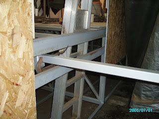 Here's the outside of the slide out for the queen sized bed and night stands. The siding looks smudged from cleaning up the caulking with the acetone. For now I have shoved pipe insulation around the slide outs till I get them all skinned and can start on the trim which will hold the weather stripping and closing seal.
